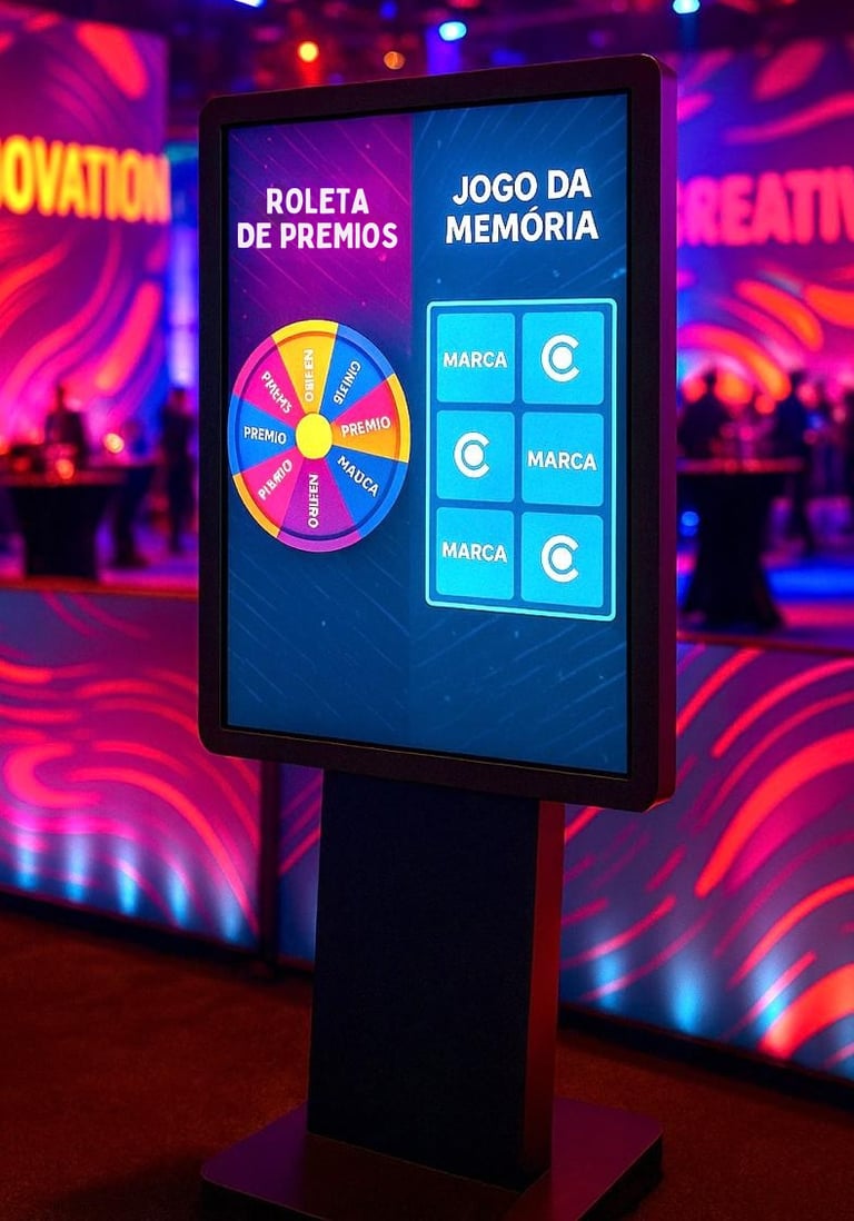 Que tal atrair a atenção do público com jogos eletrônicos superdivertidos e com a cara da sua marca? Através de um totem interativo com tela touch de 60”, criamos experiências personalizadas para eventos, com opções como roleta de prêmios, jogo da memória e muito mais. É diversão na certa e engajamento garantido!