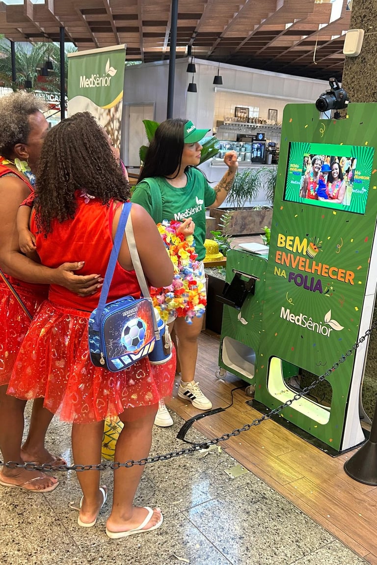 A imagem final pode ser impressa na hora ou compartilhada digitalmente, gerando engajamento e uma recordação divertida e personalizada da sua marca ou evento.